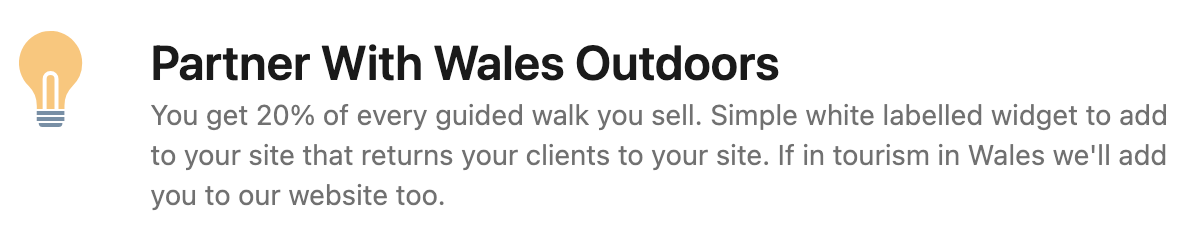 All we would like you to do is add this or similar text to your website and the widget too (we’ll provide the code) and we’ll set you up as a reseller. It’s a five minute job, the widget can be tailored to your location, and immediately you are adding value to your guests stay with our Five Star guided hikes in Wales. This will go a long way to ensuring repeat bookings and recommendations.