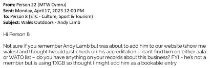 Yes, based upon my assumption, and correct in my case, that you were following Visit Wales advice, there are a few MWT members that are also not accredited with Visit Wales and it would appear to have no accreditation or qualifications. These I highlighted for you in my message, and as I said, please remove them or please list me. I said this under the assumption that Show Me Wales was in some way connected to Visit Wales, given the FOI info, and I of course apologise for making that assumption.