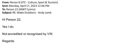 ‘Thank you for chatting to me earlier. please see the copy of the information contained within the FOI that I requested and received a few weeks ago. I would be interested to know why MWT thought it appropriate to go to Visit Wales to ask about the inclusion of Wales Outdoors on ‘Show Me Wales’ and I wonder, given I was not informed of this at the time, why MWT, contrary to what you have told me today during our phone conversation, are taking such advice from Visit Wales without engagement with the provider.
